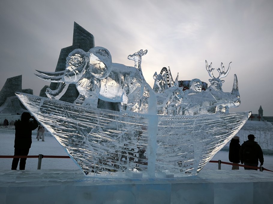 Для строительства зданий и скульптур используется лед реки Сунгари. Его разрезают на блоки, затем их складывают в замки и скульптуры людей и различных существ.