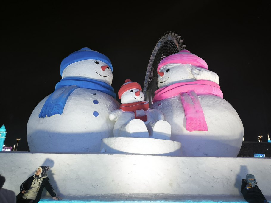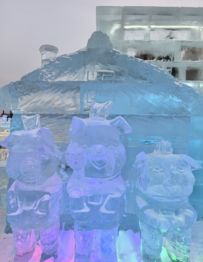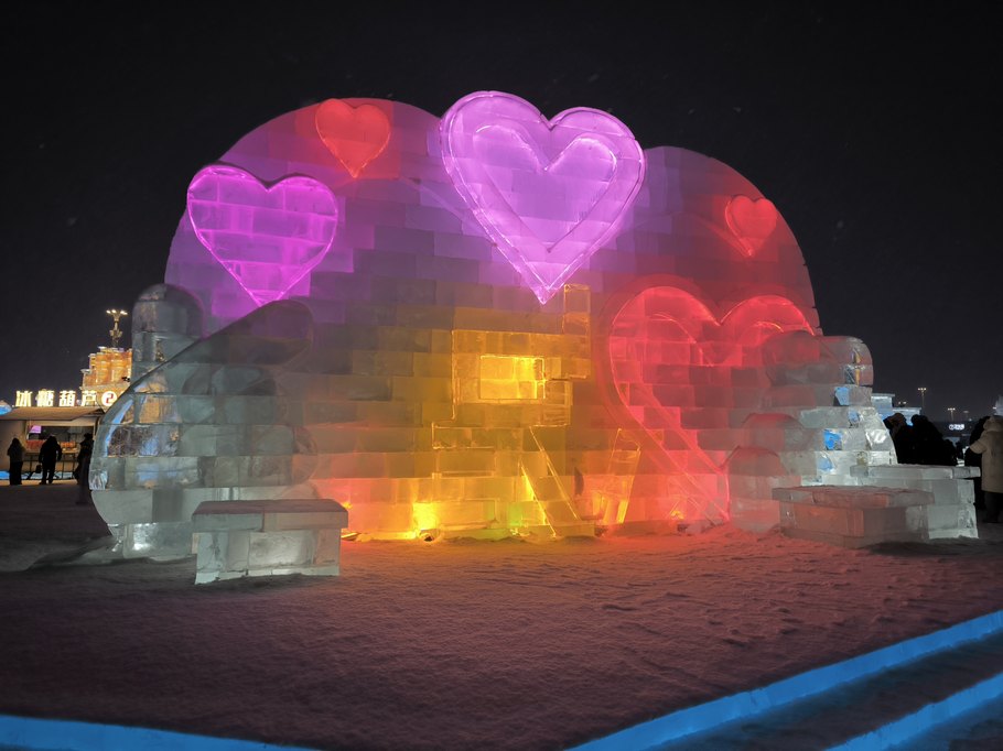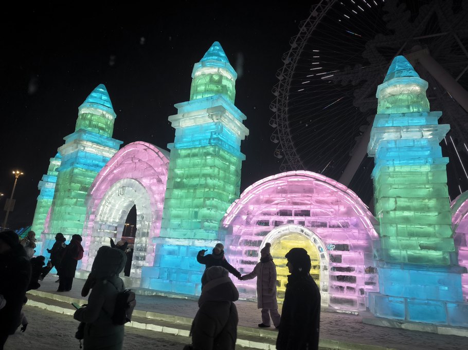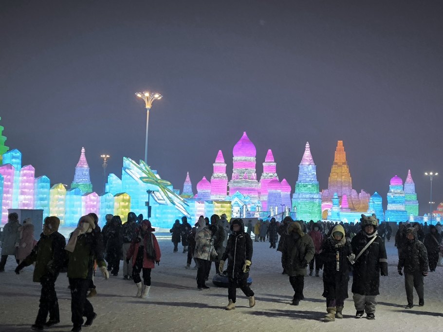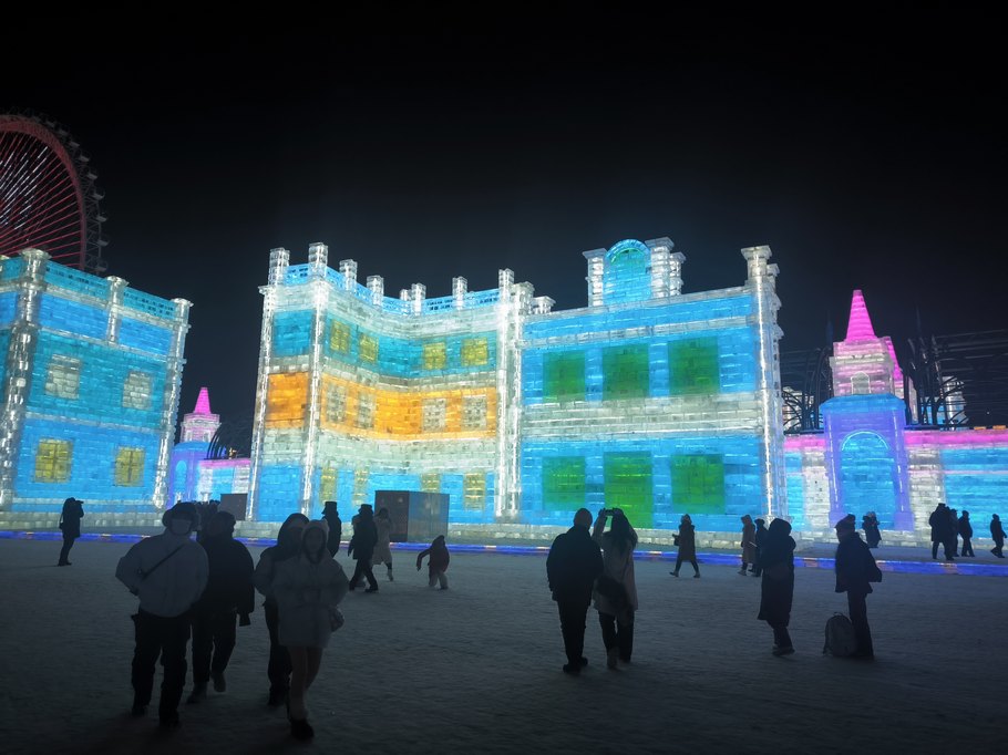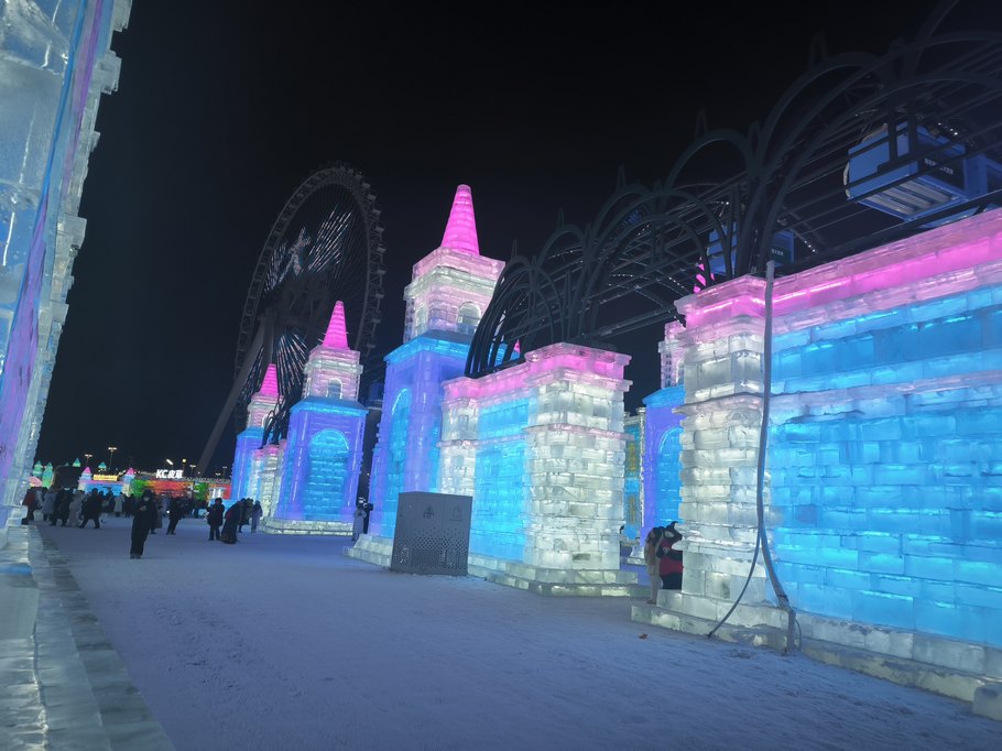 «Мир льда и снега» красивее именно в темноте, когда включается подсветка, подчеркивая многие элементы зданий и скульптур.